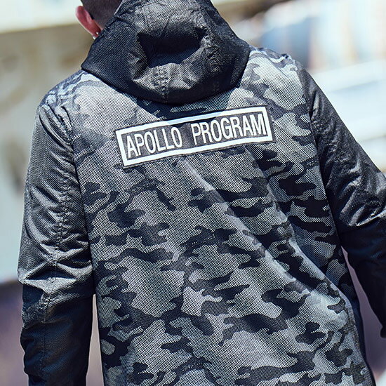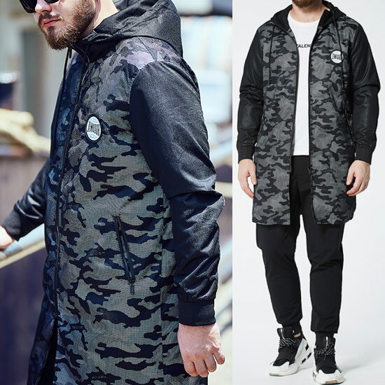 ロングコート メンズ 大きいサイズ ロングジャケット メッシュ ロングパーカー 迷彩 カモフラ ワッペン 変形 ZIP 切替 メンズファッション B系 ストリート系ファッション ヒップホップ ビッグサイズ ビックサイズ キングサイズ バスター ぽっちゃり 西海岸