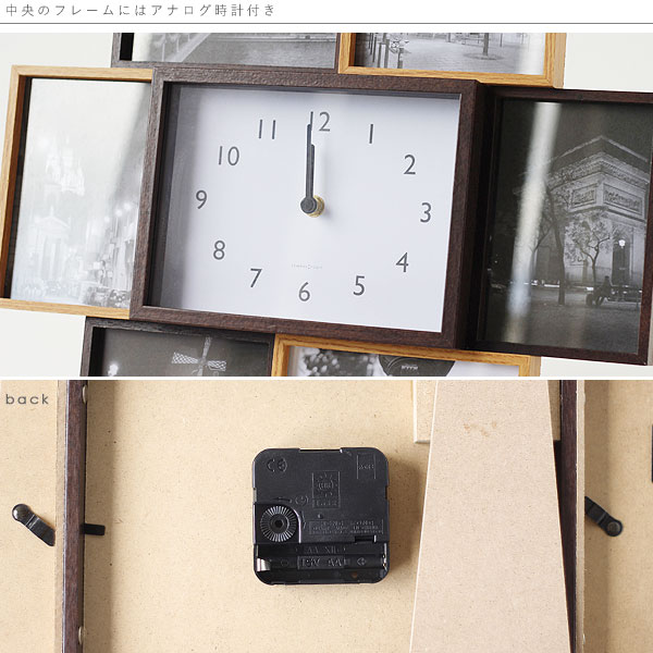 落ち着いたブラウンとビーチの木製風フレームと、凹凸のある見た目が特徴的! 中央のフレームにはアナログ時計が付いています。