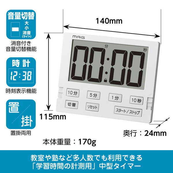 ベンガ君BIGの便利な機能■カウントダウン(0〜99分50秒)■カウントアップ(0〜99分59秒)■時計表示(12・24時間表示切替)■一時停止機能■リピート機能■音量切り替え(大・小・消音)※保護者の方がお子様と一緒に使ったり、学習塾や小会議室でのシェアでの使用も想定した幅14cmの見やすく大きめのサイズです。