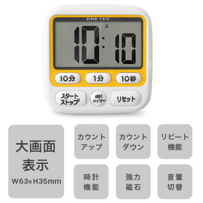使いやすくて評判のロングセラータイマー カップラーメンやパスタの茹で時間などの タイマーセットから勉強時のタイムトライアル など様々な用途で使えて便利です ●見やすい大画面 ●音量の大・小切替 ●セット時間5分以上で10分前と5分前にプレアラームでお知らせ ●ストップウォッチ(カウントアップ機能) ●もとのセット時間に戻るリピート機能 ●最大セット時間:99分50秒 ●本体サイズ(単位:m/m)=81×81×18料理や勉強の時間の管理もお任せ 時計機能付きデジタルタイマー 調理中のパスタの茹で時間や煮込み時間を知りたい時に便利なキッチンタイマー。